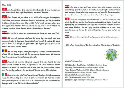 Naše pismo zajednički su oblikovale (u listopadu) Lea Kolesarić, Petra Ćosić, Antonela Safundžić (2. e), Marija Kovačević, Hanna Vuković, Elena Kurkutović i Gabrijela Holod (2. c) – hvala im. Suradničko pismo svih partnera (u studenome) potpisuju Iuliana iz Rumunjske, Dilara iz Turske, Elaa iz Tunisa i Ajdin Kuduzović (2. c). Najvrjedniji je dio objava pisama i pjesama na društvenim mrežama u Tjednu za mir… i nada da će poruke učenika doprijeti do mnogih koji ih trebaju čuti… Suradničko je pismo poslano – u znak podrške – projektnim partnerima na daljinu u Palestini. Ne moramo niti spominjati koliko je dirljiva bila njihova povratna reakcija.