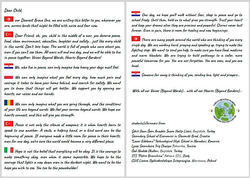 Učenici i nastavnici iz dviju turskih škola te po jedne škole iz Rumunjske, Poljske, Italije, Tunisa i Hrvatske (sudionici eTwinningova projekta Voices Beyond Words, Hearts Beyond Borders) organizirali su Week 4 Peace (Tjedan za mir, 13. – 19. studenog 2025.) kako bi zajednički obilježili World Kindness Day (Međunarodni dan ljubaznosti, 13. studenog) i World Children’s Day (Međunarodni dan djeteta, 20. studenog) u okviru drugoga projektnog modula Living in Conflict Zones – A Child’s Perspective (Život u zonama sukoba – iz dječje perspektive).