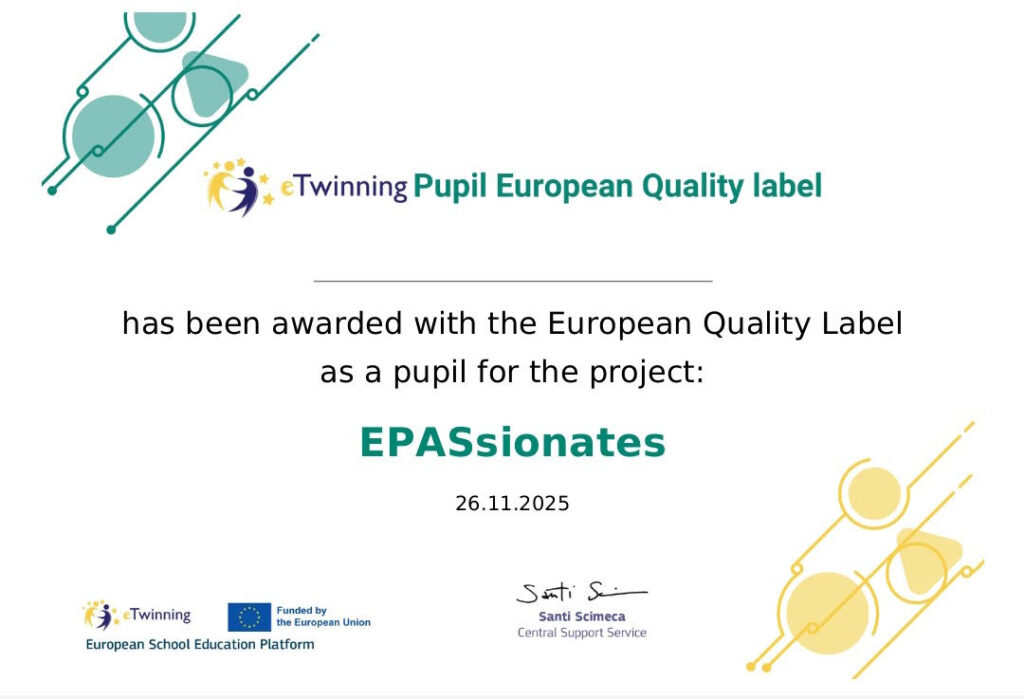 Međunarodni eTwinningov projekt EPASsionates (2024./2025.) nagrađen je 26. studenog 2025. Europskom oznakom kvalitete. Dobitnice su priznanja koordinatorice Gabriela Ciolpan i Ivana Opačak te svi partneri iz škola ambasadorica Europskoga parlamenta iz Hrvatske, Rumunjske, Grčke i Španjolske. Ove će godine i učenici dobiti zaslužena priznanja. Čestitamo svima!