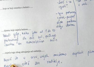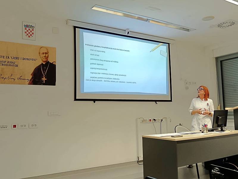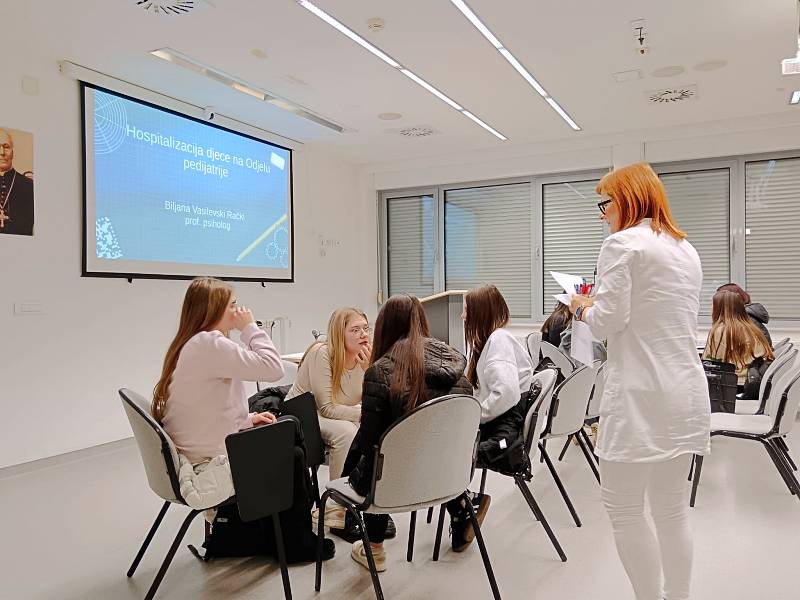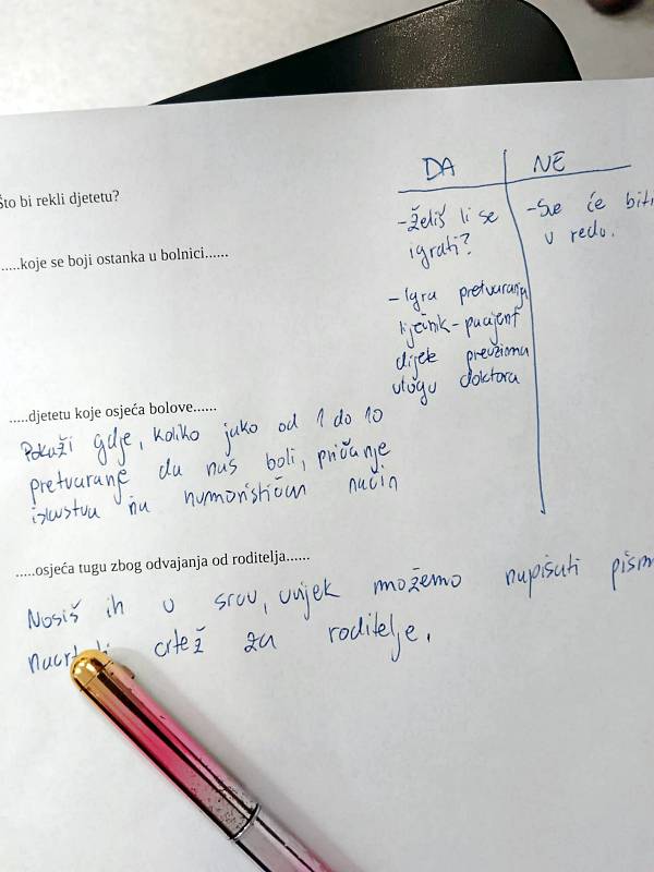 Podijeljeni u skupine promišljali su kojim riječima, načinima pristupiti osobama na pedijatriji.  Iskazali su se u kreiranju izazovnog zadatka kojim bi se oplemenio boravak u bolnici. Psihologinja je istaknula kako je prisutnost volontera zaista potrebna i dobrodošla. Pacijentima na pedijatriji volonteri amortiziraju osjećaj nelagode radi boravka u bolnici. Igrama i posjetom pomažu im u prihvaćanju osobne situacije, olakšavaju proces popodnevnog iščekivanja u kojem nema zakazanih pretraga, odmiču osobe od malih i mobilnih ekrana, a dugi bolnički dani prolaze zanimljivije u druženju.