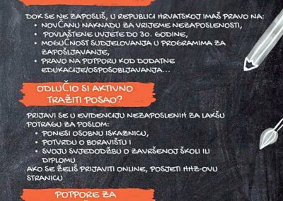 Četvrta skupina izradila je informativni i vizualno privlačan letak namijenjen mladima koji se prvi put susreću s prijavom na Hrvatski zavod za zapošljavanje. U letku su jasno opisana prava nezaposlenih, proces prijave, potrebna dokumentacija te mogućnosti koje HZZ nudi kroz podršku i savjetovanje. Letak je zamišljen kao praktični alat za njihove vršnjake.