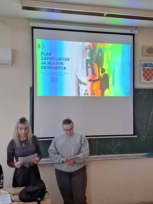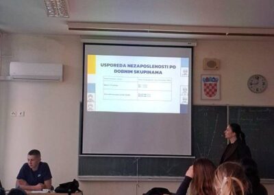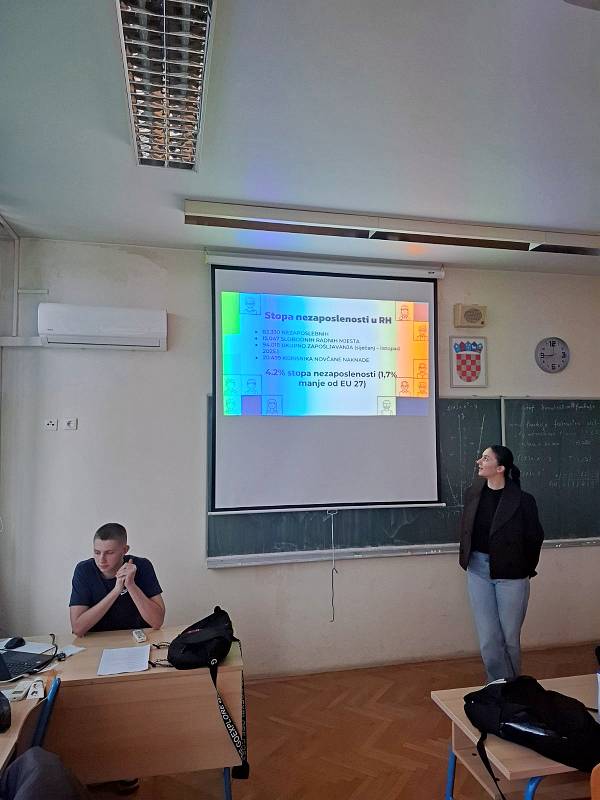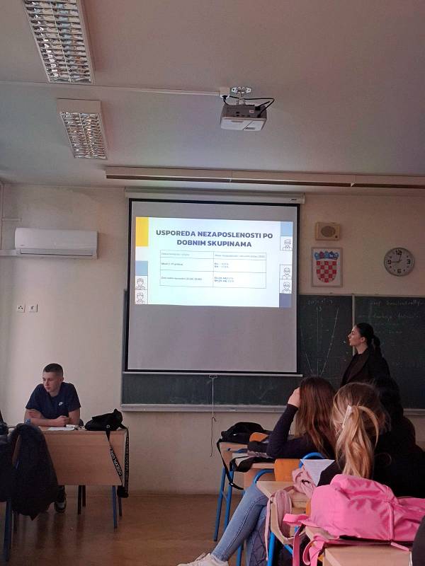 Prva skupina imala je zadatak istražiti službene podatke Državnog zavoda za statistiku i Eurostata o stopi nezaposlenosti mladih u dobi od 18 do 25 godina. Učenici su analizirali višegodišnje trendove, izrađivali grafikone te uspoređivali položaj mladih u Hrvatskoj s prosjekom Europske unije. Njihova prezentacija potaknula je raspravu o razlozima visoke nezaposlenosti, uključujući nedostatak radnog iskustva, strukturne razlike i migracije mladih.