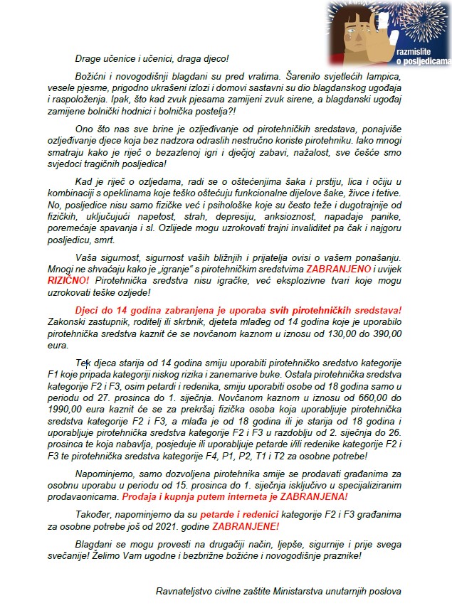 Svjesni strašnih posljedica pri nestručnoj uporabi pirotehničkih sredstava o kojima svake godine svjedoče i brojke o ozljedama, Ravnateljstvo civilne zaštite Ministarstva unutarnjih poslova upućuje apel vezan za pirotehniku svim učenicima.