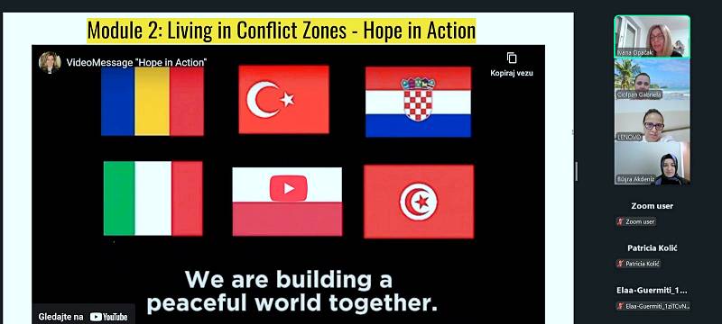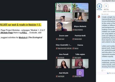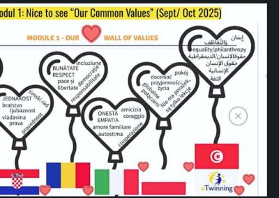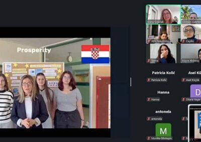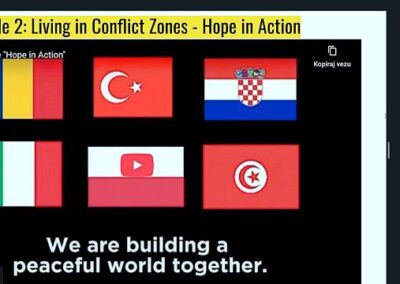 U uvodnome dijelu sastanka predstavljeni su rezultati prvih dvaju projektnih modula. Modul 1 – My Story, Our Values (o kojemu smo pisali OVDJE) omogućio je učenicima istraživanje osobnih identiteta i zajedničkih vrijednosti, čime je postavljen snažan temelj za međunarodnu suradnju. Modul 2 – Living in Conflict Zones (o kojemu smo pisali OVDJE) potaknuo je učenike na razvoj empatije spram položaja djece u ratnim i kriznim područjima kroz istraživački rad i izradu zajedničke videoporuke Hope in Action, koja je istaknula otpornost i nadu.
