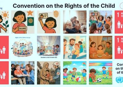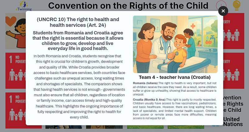 Osim toga, učenici su sudjelovali u izradi interaktivne slike na platformi Genially, posvećene dječjim pravima. Sudionici sastanka pozvani su na izradu vizualnih sadržaja uz pomoć umjetne inteligencije kako bi obogatili zajednički digitalni proizvod. OVDJE možete pogledati što se krije iza 17 polja i ponekih vizuala (interaktivna je slika još u izradi). Pročitajte na što sve djeca imaju pravo i kako se konkretna prava u partnerskim zemljama poštuju i(li) krše… Promislite i vi o tome jesu li i kako navedena prava povezana sa 17 ciljeva održivoga razvoja…