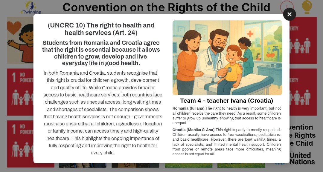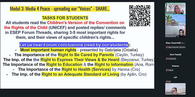 - zaključke Tima 1 (koji je koordinirala nastavnica Busra Akdeniz iz Turske), s naglaskom na važnost prava na roditeljsku skrb te prava na izražavanje i uvažavanje osobnoga mišljenja predstavilo je dvoje učenika iz Turske;