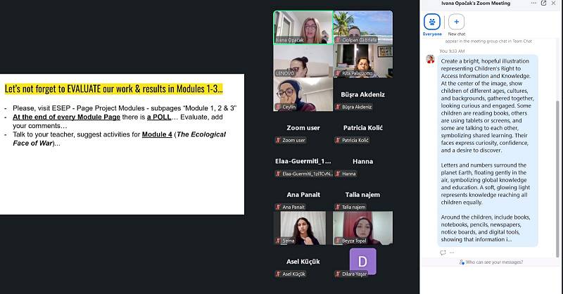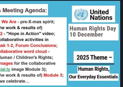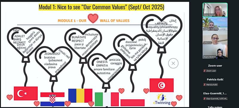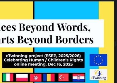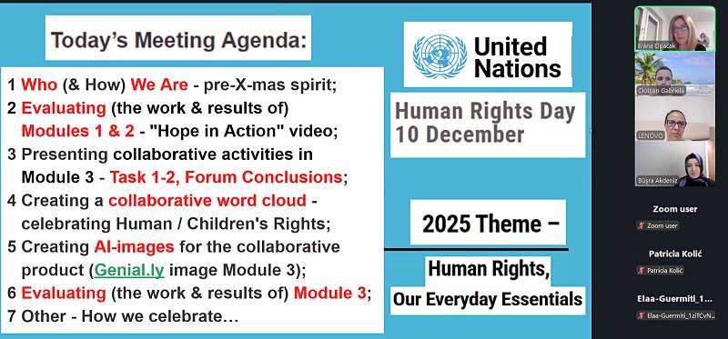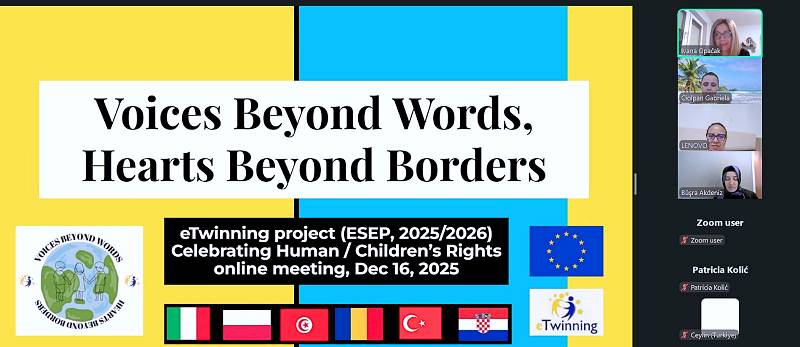 U sklopu eTwinningova projekta Voices Beyond Words, Hearts Beyond Borders održan je 16. prosinca 2025. (18.00 – 18.45) međunarodni online sastanak povodom završetka Modula 3 – Media 4 Peace i obilježavanja Međunarodnoga dana ljudskih prava. Sastanak je okupio nastavnice i učenike partnerskih škola iz Turske, Tunisa, Rumunjske, Italije i Hrvatske, s ciljem predstavljanja postignuća, razmjene učeničkih glasova te promišljanja o (učenju povezanom s) ljudskim i dječjim pravima. (PO)HVALA osmero učenika naše škole, koji su nas lijepo predstavili.