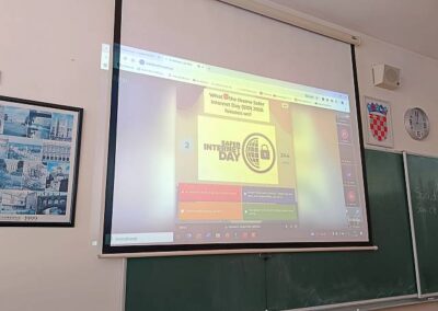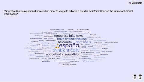 U drugome dijelu događanja učenici iz Španjolske i Rumunjske održali su kratko izlaganje o važnosti Dana sigurnijega interneta i poučavanja medijske pismenosti kroz (izvan)nastavne sadržaje u školi i u okviru projektne suradnje. Zajednički oblak riječi na platformi Mentimeter sjajno je sažeo zaključne poruke učenika vezane za ono na što (ne samo) mladi trebaju obratiti pozornost kako bi bili sigurni(ji) u online okruženju. Evaluacija događanja, koja je uslijedila, također dokazuje kako, bez obzira na pokazano znanje velikoga broja učenika (68% točnih odgovora na kvizu), uvijek ima prostora za novo učenje i napredak.