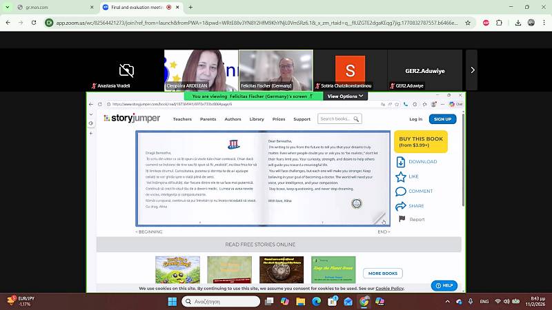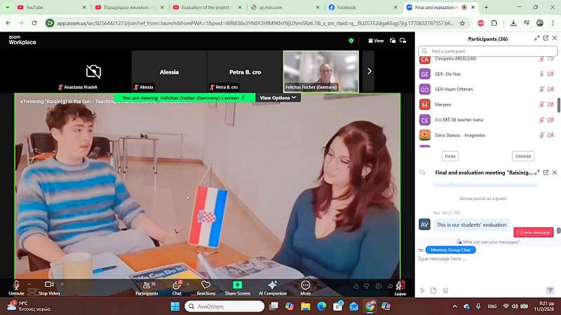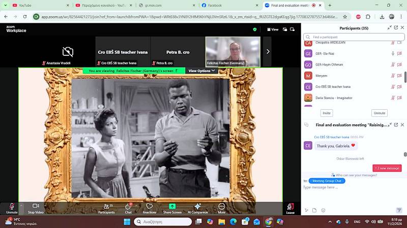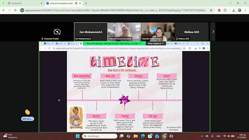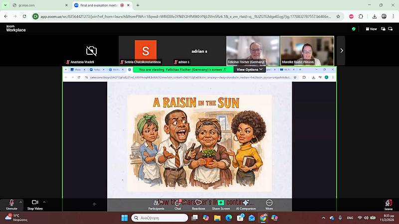 Završni sastanak u sklopu međunarodnoga eTwinningova projekta Raisin(g) in the Sun održan je 11. veljače 2026. (19.00 – 20.15), ne slučajno, u Mjesecu afroameričke povijesti (poznatome i kao Black History Month). Učenici i nastavnici – predstavnici partnerskih škola iz Grčke, Njemačke, Rumunjske i Hrvatske – predstavili su rezultate projektne suradnje i sudjelovali u evaluaciji projekta. (PO)HVALA Petri Bajan (2. e), koja je, uz podršku prof. Opačak, veoma lijepo predstavila našu školu i rezultate rada jednoga međunarodnog tima.
