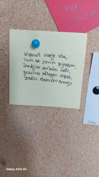 Kroz nastavu geografije izradili smo (2. e, 1. g) zid ideja na kojem su pojedinci ostavljali svoje poruke na temu „Što mogu promijeniti?“. Za stvaranje idejne atmosfere, koristili smo HRT-ovu emisiju „Školski sat: Ne postoji plan(et) B“. Drugi dio razreda (2. a i 4. e) sudjelovao je u radionici izrade i ukrašavanja postojećih modnih dodataka, torbica i pernica, koje smo koristili kao nagrade našim sudionicima i pobjednicima geografskog kviza.