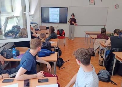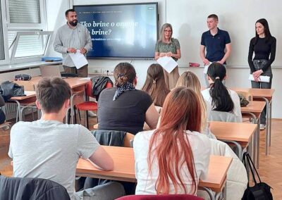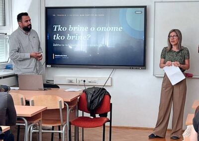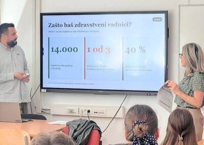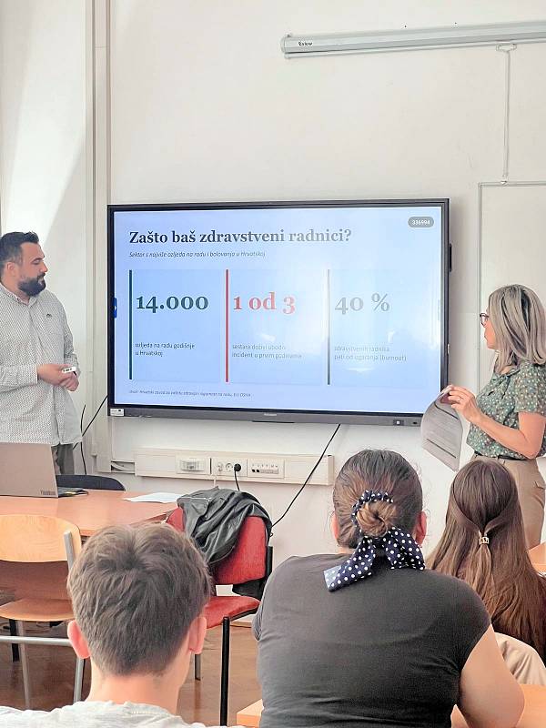 Radionica je započela uvodnim razmatranjem o specifičnim rizicima s kojima se zdravstveni radnici svakodnevno suočavaju. Senior ambasadori istaknuli su zabrinjavajuću statistiku: zdravstvo je jedan od sektora s najvišom stopom bolovanja zbog izrazitih tjelesnih i psihičkih napora. Kroz interaktivnu prezentaciju, učenici su upoznati s tri ključna pojma: opasnostima (poput uboda na iglu), štetnostima (poput virusa ili citostatika) te naporima (poput smjenskog rada i podizanja pacijenata).