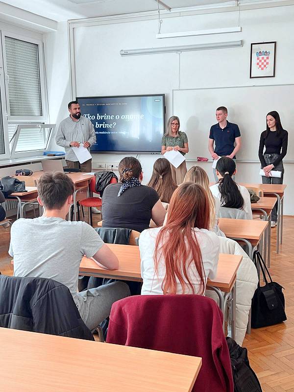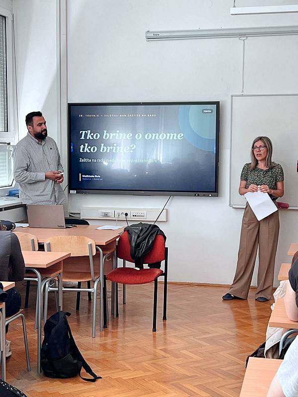 Radionicu pod nazivom „Tko brine o onome tko brine? – Zaštita na radu medicinske sestre/tehničara“ osmislili su i vodili senior ambasadori Ivana Opačak i Ivan Devčić iz Ekonomsko-birotehničke škole. U realizaciji su im pomogli junior ambasadori Mateo Lebić i Vanessa Ivić, učenici 4. c razreda, koji su svojim vršnjacima, učenicima 4. razreda Srednje medicinske škole, prenijeli ključne poruke o važnosti sigurnosti na radnom mjestu.